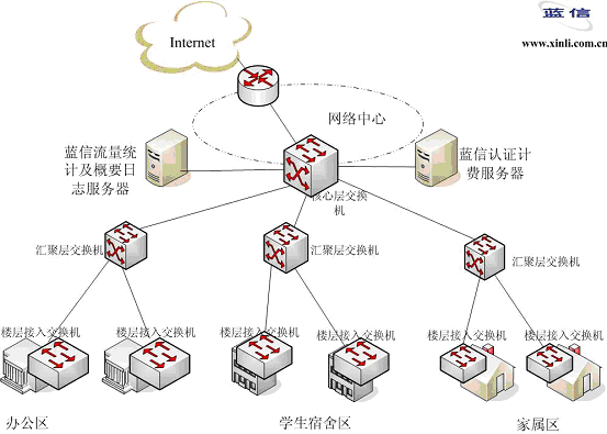 在網(wǎng)絡(luò)中心機(jī)房部署“藍(lán)信認(rèn)證計費系統(tǒng)”,藍(lán)信認(rèn)證計費系統(tǒng)除支持標(biāo)準(zhǔn)的RADIUS協(xié)議外,還支持領(lǐng)先的802.1x協(xié)議,通過與各接入層交換機(jī)的配合,實現(xiàn)了認(rèn)證管理功能。通過綁定帳號、IP、MAC地址等15元素,真正保證只有合法用戶才能通過認(rèn)證;對用戶進(jìn)行分級權(quán)限管理,可按信用度等級對用戶進(jìn)行劃分,方便了用戶的管理。此外,在網(wǎng)絡(luò)出口處部署藍(lán)信流量統(tǒng)計工具,通過與藍(lán)信認(rèn)證計費系統(tǒng)的配合,實現(xiàn)對用戶按流量來計費,可以把用戶訪問流量按校內(nèi)校外、國內(nèi)國際來區(qū)別對待,并設(shè)置不同的費率。同時,還部署了藍(lán)信概要日志系統(tǒng),有效記錄了用戶的上網(wǎng)信息,并提供人性化的web客戶端,方便管理者進(jìn)行事后查詢,有效的控制了網(wǎng)絡(luò)的安全性。