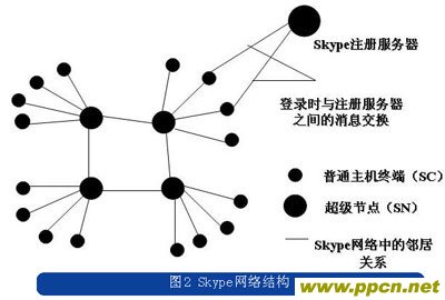 與常規(guī)的電信業(yè)務(wù)網(wǎng)絡(luò)不同的是,Skype的網(wǎng)絡(luò)中除了注冊(cè)服務(wù)器,沒(méi)有其他任何集中的服務(wù)器,只是將用戶節(jié)點(diǎn)分為普通節(jié)點(diǎn)和超級(jí)節(jié)點(diǎn)。Skype的系統(tǒng)連接結(jié)構(gòu)如圖2所示。