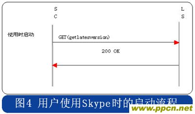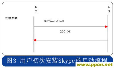Skype的用戶終端啟動(dòng)時(shí),采用HTTP協(xié)議連接到注冊(cè)服務(wù)器,用戶初次安裝的啟動(dòng)流程中攜帶“installed”的參數(shù),使用時(shí)啟動(dòng)流程則在消息中攜帶“getlatestversion”參數(shù),具體流程分別見(jiàn)圖3和圖4。
