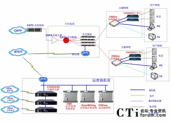 - 中國電信、新網(wǎng)通、中國移動分別通過E1線路接入小區(qū)機房內(nèi)數(shù)字中繼網(wǎng)關(guān),通過該設(shè)備進行PCM和IP轉(zhuǎn)換后接入IP數(shù)據(jù)網(wǎng)絡(luò)。通過CMC軟交換控制平臺實現(xiàn)任意終端用戶的放號及計費業(yè)務(wù)。