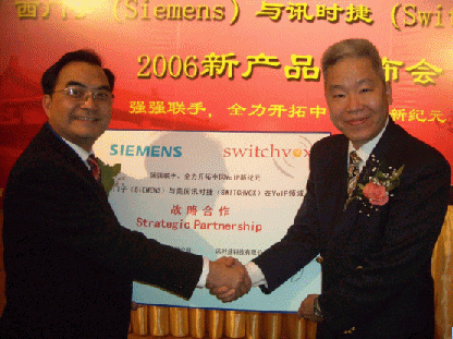2006年3月29日的北京,還有些春風料峭,但北京長富宮的芙蓉廳卻是暖意融融,德國通訊業(yè)巨擘西門子(Siemens)和美國企業(yè)通訊業(yè)新寵訊時捷(Switchvox)聯(lián)合舉辦VoIP新產(chǎn)品發(fā)布會,西門子終端通訊設(shè)備(上海)有限公司CEO