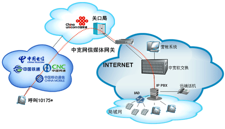 企業(yè)自行從網(wǎng)站上成功申請“企業(yè)商務(wù)通” 業(yè)務(wù)后,通過101756*全國統(tǒng)一接入號后結(jié)合中寬網(wǎng)信推薦的IPPBX,當(dāng)外部對企業(yè)申請的10175*號碼發(fā)起呼叫時(shí),該呼叫通過中國聯(lián)通的線路將話務(wù)指向中寬網(wǎng)信的媒體網(wǎng)關(guān),由中寬軟交換平臺將呼叫送至指定的IP