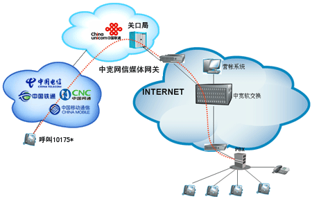 企業(yè)或個(gè)人自行從網(wǎng)站上成功申請“企業(yè)商務(wù)通”或“個(gè)人隨身行”業(yè)務(wù)后,通過101756*全國統(tǒng)一接入號結(jié)合中寬網(wǎng)信推薦的思科linksys網(wǎng)關(guān)或網(wǎng)絡(luò)電話使用,當(dāng)外部對您申請的10175*號碼發(fā)起呼叫時(shí),該呼叫通過中國聯(lián)通的線路將話務(wù)指向中寬網(wǎng)信的媒體網(wǎng)關(guān),由中寬軟交換平臺將呼叫送至您指定的電話上。另外,當(dāng)您使用該業(yè)務(wù)外呼時(shí),可以選擇在被叫電話上顯示10175*或隱藏號碼。