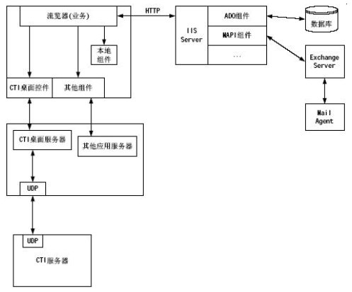 對(duì)于所有的電力業(yè)務(wù)模塊都是在IE瀏覽器上實(shí)現(xiàn),瀏覽器上的應(yīng)用模塊對(duì)WEB Server發(fā)出請(qǐng)求,WEB Server解釋運(yùn)行ASP程序,利用ASP創(chuàng)建數(shù)據(jù)庫(kù)組件訪問(wèn)系統(tǒng)的數(shù)據(jù)庫(kù)信息;利用嵌入WEB頁(yè)面的CTI桌面控件可以實(shí)現(xiàn)CTI集成功能,如:建立呼叫、應(yīng)答呼叫、席間轉(zhuǎn)移、人工自動(dòng)切換等等;利用其他嵌入WEB網(wǎng)頁(yè)的組件實(shí)現(xiàn)其他擴(kuò)展功能,如:Exchange
