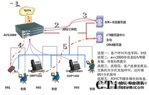 在方案中外線呼入IPPBX,IPPBX根據(jù)呼入路由指向特定rtsp號碼,rtsp根據(jù)配置引導IVR服務器開始播放語音,客戶根據(jù)語音提示按鍵轉(zhuǎn)接坐席、傳真或自動語音應答等;坐席接聽時同時屏幕彈出CRM中關于該來電號碼的相關信息,使坐席能做針對性的應答和服務,同時記錄報表數(shù)據(jù)供查詢。