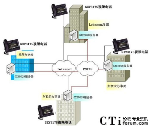 在Tabbara公司的全球四個辦事處分別安裝潮流網(wǎng)絡(luò)的GXE5028 IPPBX服務(wù)器或者其他的SIP Sever通信平臺,GXE5028 IP PBX支持語音信箱,郵件和其他通信功能應(yīng)用,每一臺GXE5028最大限度地支持分布全球辦事處的所有通信賬號同時連接到同一網(wǎng)絡(luò)中,終端連接IP電話,IP視頻電話以及IP視頻監(jiān)控攝像機作為語音/數(shù)據(jù)的輸入輸出,當(dāng)然IP PBX也可通過網(wǎng)絡(luò)連接到VoIP服務(wù)器中間位置的SIP中繼。潮流網(wǎng)絡(luò)的GXV3175多媒體觸摸屏視頻電話,支持標(biāo)準(zhǔn)的SIP協(xié)議,先進的H.264/H.263/H.263+視頻壓縮標(biāo)準(zhǔn),寬大的7寸彩色觸摸顯示屏實現(xiàn)溝通面對面的零距離交流,以及撥打網(wǎng)絡(luò)攝像機觀看監(jiān)控現(xiàn)場。潮流網(wǎng)絡(luò)的GXV3662_HD高清防暴半球IP攝像機和GXV3651_HD IP攝像機,分別安裝在辦事處關(guān)鍵位置,365天,每周24*7個小時進行實時監(jiān)控,作為企業(yè)財產(chǎn)和人員安全的保障。方案中,各分支機構(gòu)之間通話免費,撥打分支機構(gòu)所在地其他電話按市話費算,出差人員使用IP電話與公司內(nèi)部通話免費。