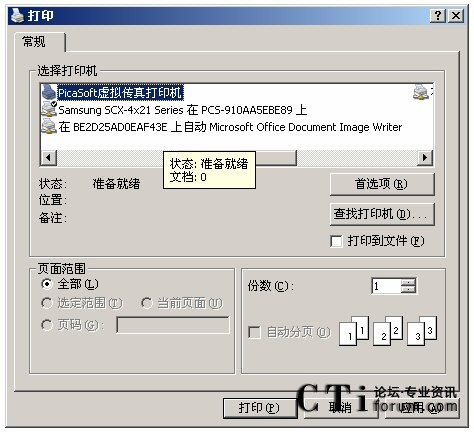 發(fā)送傳真配合PCS的虛擬打印軟件,打開一個文本,或者DOC文件,CTRL+P,選擇“PicaSoft虛擬傳真打印機(jī)”,如下圖: