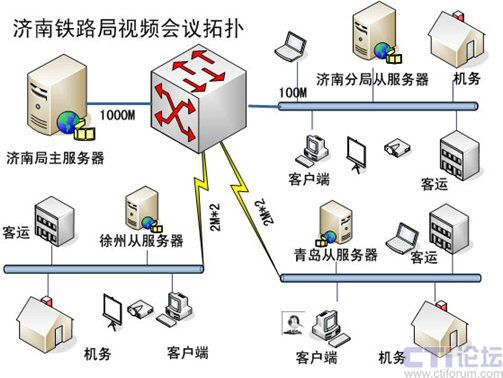 由于路局改革后組織結(jié)構(gòu)的特點(diǎn),決定了跨地域會(huì)議較多,如濟(jì)南和徐州、青島之間召開(kāi)的部門(mén)級(jí)別的會(huì)議比較頻繁,加上三地之間的帶寬制約,本方案建議采用主從服務(wù)器的系統(tǒng)架構(gòu),1主3從,主服務(wù)器設(shè)置在路局網(wǎng)絡(luò)中心,原來(lái)濟(jì)南分局位置設(shè)置1臺(tái)從服務(wù)器,負(fù)責(zé)濟(jì)南地區(qū)的內(nèi)部會(huì)議,以及與其他2地的遠(yuǎn)程會(huì)議,同樣徐州、青島也各設(shè)置1臺(tái)從服務(wù)器。