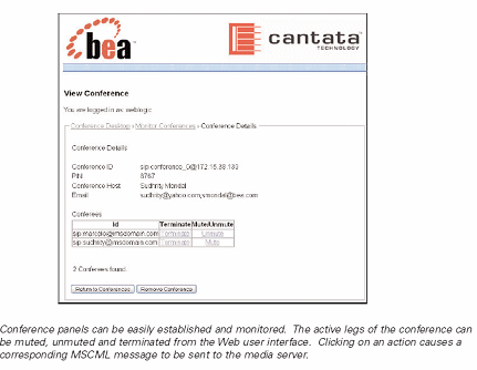 (圖中文字)會議面板可以很容易地建立和監(jiān)控。會議的激活可以通過網(wǎng)絡(luò)用戶界面設(shè)置靜音、取消靜音或終止。 點擊特定的操作將引發(fā)相應(yīng)的MSCML消息傳送至媒體服務(wù)器。