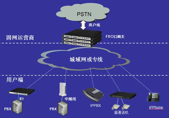 “固網(wǎng)IP化”方案無需軟交換,延用現(xiàn)有的數(shù)字程控交換機(jī)與業(yè)務(wù)支持系統(tǒng)作為核心網(wǎng)業(yè)務(wù)平臺,只是在交換機(jī)外圍增加實(shí)現(xiàn)模擬/數(shù)字語音信號轉(zhuǎn)換成IP的VoIP網(wǎng)關(guān),并通過IP網(wǎng)絡(luò)實(shí)現(xiàn)與遠(yuǎn)程客戶終端設(shè)備的連接。遠(yuǎn)程的用戶端設(shè)備可以是傳統(tǒng)設(shè)備,如普通電話、傳真機(jī)或小型交換機(jī),也可以是基于IP的語音設(shè)備,如SIP電話、IPPBX等(如下圖所示)?梢詫(shí)現(xiàn)小區(qū)放號、企業(yè)直線電話、企業(yè)語音交換機(jī)接入等業(yè)務(wù)。