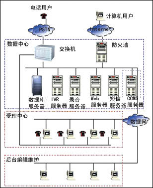 系統(tǒng)的體系結(jié)構(gòu),主要包括三個部分:數(shù)據(jù)中心、受理中心和維護中心。受理中心與數(shù)據(jù)中心之間采用E1連接,具有2M的數(shù)據(jù)通信能力;維護中心與數(shù)據(jù)中心之間采用64K DDN線路連接,三個中心分布在三個不同的地方。目前受理中心負責(zé)全省的所有業(yè)務(wù),客戶通過本地市話經(jīng)由移動電信網(wǎng)絡(luò)將話路指向受理中心,通過數(shù)據(jù)中心的具有排隊功能的交換機,根據(jù)被叫號碼和客戶服務(wù)要求,將講話路轉(zhuǎn)接到自動臺或人工臺席,為客戶提供服務(wù)。當(dāng)用戶呼叫信息臺電話后,進入到交換機,交換機將來話消息通知驅(qū)動池,驅(qū)動池將相關(guān)消息轉(zhuǎn)換為標(biāo)準(zhǔn)格式,通知CCMS,CCMS根據(jù)來話被叫號,根據(jù)管理系統(tǒng)的定義,啟動相應(yīng)的IVR腳本,交給IVR解釋器解釋并由IVR服務(wù)器執(zhí)行,當(dāng)服務(wù)為自動臺完成時,由IVR服務(wù)器實現(xiàn)(如:語音引導(dǎo)、適合自動服務(wù)的內(nèi)容等);當(dāng)用戶需要人工服務(wù)時,CCMS管理系統(tǒng),根據(jù)用戶的服務(wù)要求,按照話路分配原則(通過管理系統(tǒng)定義),選擇最合適的話務(wù)員為其服務(wù),同時CCMS管理系統(tǒng)會將相關(guān)的頁面在話務(wù)員的臺席上顯示出來,同時顯示主叫號碼以及來話標(biāo)示,當(dāng)話務(wù)員應(yīng)答后,即可開始受理,受理的內(nèi)容通過Web服務(wù)器完成,同時對于需要查詢數(shù)據(jù)庫的訪問,通過應(yīng)用服務(wù)器,進行數(shù)據(jù)訪問,并返回結(jié)果。當(dāng)服務(wù)完畢,本次呼叫即結(jié)束。