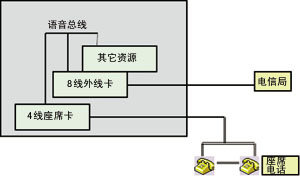 在傳統(tǒng)的語音卡設(shè)計(jì)中,一些語音卡廠商采用一體化設(shè)計(jì),根據(jù)功能的要求,采用通用的分離元件和集成電路自行設(shè)計(jì)電路。采用該類設(shè)計(jì)的語音卡板卡的通道類型、功能、通道數(shù)量在設(shè)計(jì)之初已決定,因而靈活性較差,在構(gòu)成CTI系統(tǒng)時(shí)會造成通道資源的浪費(fèi)。圖1展示了用此類板卡如何構(gòu)筑一個(gè)8外線+3座席的CTI系統(tǒng),當(dāng)用戶需要增加一個(gè)外線通道時(shí),就需另增加一塊外線卡,投資較大。