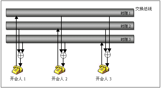由于會議的資源是分布在各個通道,因此電話會議功能可以具有極大的靈活性,只有一塊卡的小系統(tǒng)也可以擁有電話會議功能,既可以召開所有通道參加的大會議,也可以同時召開一系列參加人數(shù)不同的小會議,會議功能的各項指標,如會議數(shù)目,會議參加人數(shù),發(fā)言人數(shù)等基本上都不受限制。下圖以一個三方會議的實現(xiàn)說明分布式電話會議的概念。