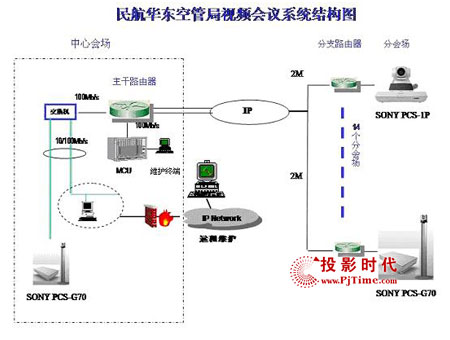 經(jīng)過考察后,確定了在民航華東空管局中心設(shè)立主會場,14個空管中心(站)為分會場。整個視頻會議系統(tǒng)是基于H.323,主會場配置了1臺視頻會議終端Sony