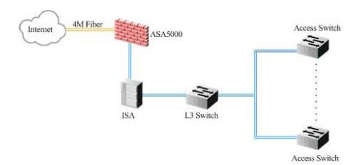 辦公專用網(wǎng)通過一條4M光纖線路連入CNC網(wǎng)絡(luò),在酒店內(nèi)部安裝了ASA5000和ISA等安全管理設(shè)備,ISA承擔(dān)了NAT等功能;辦公網(wǎng)的信息點(diǎn)數(shù)量大概在200個(gè)左右。