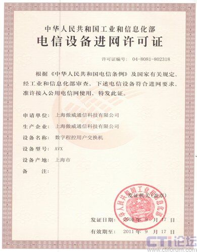 近日,國內(nèi)知名的VOIP全系列產(chǎn)品和解決方案提供商---傲威通信科技有限公司,自主研發(fā)的AVX系列語音電話交換機(jī)順利通過工業(yè)與信息化部審核,取得“電信設(shè)備進(jìn)網(wǎng)許可證”。此舉標(biāo)志著傲威通信的AVX系列產(chǎn)品已成功取得接入國家電信網(wǎng)的資質(zhì),為大規(guī)模的推廣應(yīng)用打下了堅實基礎(chǔ)。
