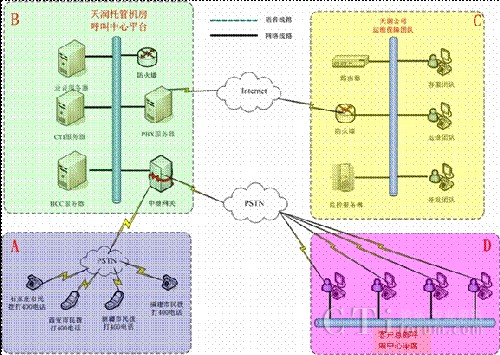 方案一:400電話(huà)+托管呼叫中心平臺(tái)+坐席分布在總部和分布點(diǎn)