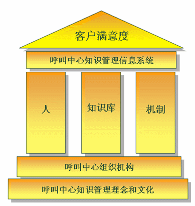 如上圖呼叫中心知識(shí)管理大廈。其是建立在呼叫中心知識(shí)管理理念文化、組織機(jī)構(gòu)基礎(chǔ)上,以人、知識(shí)庫(kù)、機(jī)制為核心,通過(guò)呼叫中心知識(shí)管理信息系統(tǒng)承載實(shí)施,以提高客戶(hù)滿(mǎn)意度為目的的綜合系統(tǒng)。