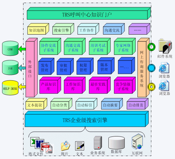 TRS Call Center 知識(shí)管理系統(tǒng)構(gòu)建在TRS企業(yè)級(jí)搜索引擎之上,融合了TRS文本挖掘技術(shù)和內(nèi)容管理技術(shù),全面包括知識(shí)庫(kù)、競(jìng)爭(zhēng)情報(bào)、專(zhuān)家網(wǎng)絡(luò)、培訓(xùn)考試、溝通交流和協(xié)作交流六大子系統(tǒng),以及發(fā)布管理、審批管理、權(quán)限管理、版本控制等系統(tǒng)管理模塊;并集成面向用戶(hù)的網(wǎng)上咨詢(xún)服務(wù)系統(tǒng),提供面向客戶(hù)管理信息系統(tǒng)(CRM)、自動(dòng)語(yǔ)音應(yīng)答系統(tǒng)(IVR)、Help