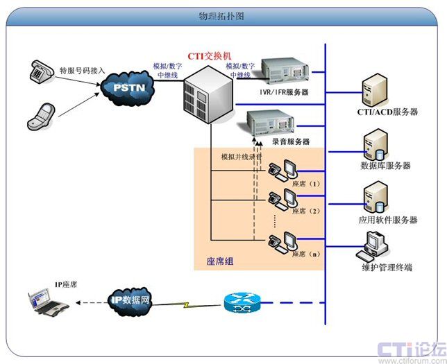 CTI交換機(jī):作為全網(wǎng)的語(yǔ)音呼叫接入控制設(shè)備,提供全網(wǎng)呼叫處理和信令接續(xù),共同完成系統(tǒng)話務(wù)的接續(xù)、控制等;并提供相應(yīng)的線路與