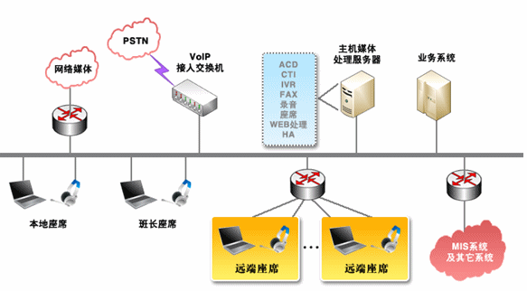 我們可以非常明確的一點(diǎn)是:采用分布式座席的技術(shù),使得遠(yuǎn)端座席與中心座席除了地域上的差異,其它部分完全相同。可以說只要網(wǎng)絡(luò)無極限,座席分布就是無極限的。