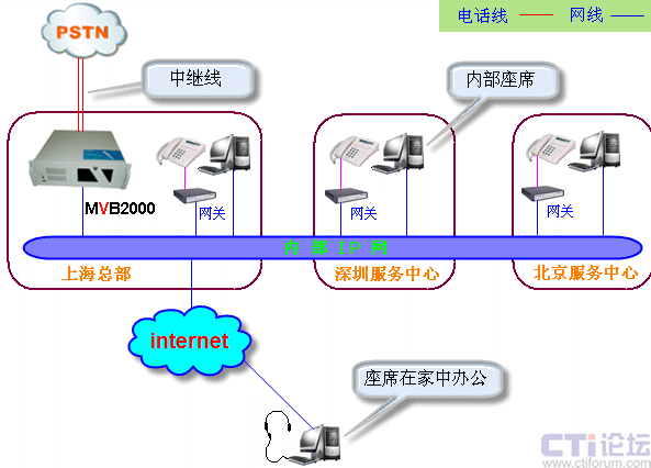 在技術(shù)上,MVB2000 的語音業(yè)務(wù)通過電信運(yùn)營商的模擬或者數(shù)字中繼線路接入,數(shù)據(jù)業(yè)務(wù)都通過局域網(wǎng)或者互聯(lián)網(wǎng)使用TCP/IP協(xié)議傳送,解決了呼叫中心中大量數(shù)據(jù)傳送的需求,請看下面的網(wǎng)絡(luò)組織結(jié)構(gòu)圖: