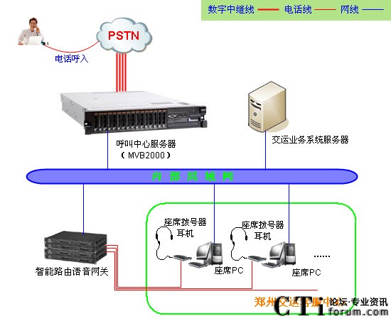 鄭州交運服務熱線采用暢信達通信MVB2000系統(tǒng)作為交換平臺,采用企業(yè)級智能路由語音網關結合話機作為座席終端,系統(tǒng)共接入數(shù)字中繼線4條(4E1),座席分機90臺,系統(tǒng)通過內部局域網組網,系統(tǒng)架構形式如下: