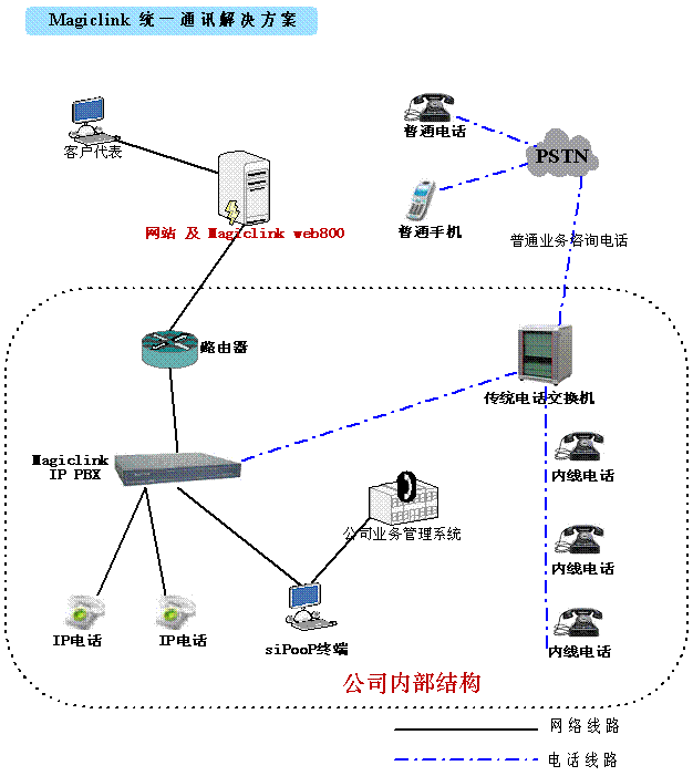 Magiclink統(tǒng)一通訊解決方案利用我公司的全線產(chǎn)品,將企業(yè)的:網(wǎng)站、內(nèi)部電話、呼叫中心、客戶管理系統(tǒng)完整的整合在一起。通過這種整合起到了:降低成本、增加營(yíng)銷手段、提升資源利用率的特點(diǎn)。
