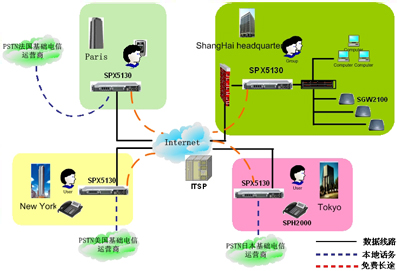 隨著公司在全世界開設眾多的部門,IP電話技術將會是不同分公司之間實現(xiàn)低費用高品質語音通訊的方式。SINOCO公司的IP-PBX 系統(tǒng)解決方案,利用 SPX-5130設備通過互連網(wǎng)連接到公司的各個分支機構,提供分級體系結構,更進一步提供了可靠的,靈活的語音通訊解決方案,從而滿足公司快速回應客戶的需求。同時,它也降低了總部和分部之間的電話費用?偛亢头植块g昂貴的國際電話費用將不再存在, 而且享受高品質的語音通訊質量。
