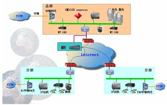 由于電信運(yùn)營(yíng)商的線(xiàn)路租賃費(fèi)用非常昂貴,對(duì)于中小企業(yè)來(lái)說(shuō)是一項(xiàng)不小的負(fù)擔(dān),所以中小企業(yè)的組網(wǎng)方式一般采用ADSL方式,來(lái)降低費(fèi)用,而ADSL的組網(wǎng)方式往往都經(jīng)過(guò)了幾層地址轉(zhuǎn)換了,這樣在分部或分支機(jī)構(gòu)的IP電話(huà)終端就無(wú)法穿透防火墻,實(shí)現(xiàn)和外面成功通話(huà),所以需要在總部配置1臺(tái)媒體路由器(MR)來(lái)做語(yǔ)音代理,完成呼叫連接的建立。