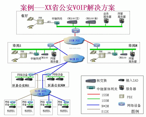 - 在全省公安IP語音專網(wǎng)系統(tǒng)覆蓋范圍以內(nèi)的用戶通過專用廣域網(wǎng)接續(xù)。省廳和各市節(jié)點的軟交換均通過中繼媒體網(wǎng)關與本節(jié)點PBX互連,全省各區(qū)縣公安局和下轄科所隊均根據(jù)接入需要配置相應端口數(shù)的語音接入設備IAD,各節(jié)點之間專網(wǎng)電話匯接、路由通過IP網(wǎng)絡來完成。