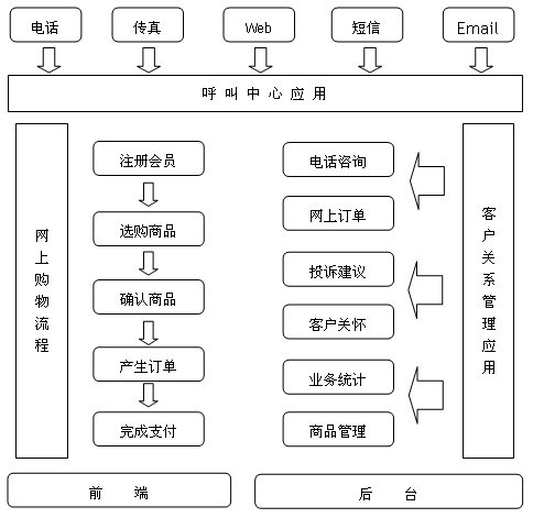 依照我公司的建設(shè)方向,中小型網(wǎng)上購(gòu)物平臺(tái)的客戶(hù)服務(wù)呼叫中心系統(tǒng)應(yīng)具備呼叫中心的基本功能,同時(shí)融入了網(wǎng)上購(gòu)物的客戶(hù)關(guān)系管理(CRM)流程,因此,它是呼叫中心與CRM系統(tǒng)的有機(jī)結(jié)合體,包含電話(huà)咨詢(xún)、網(wǎng)上訂單、客戶(hù)關(guān)懷等主要功能層的應(yīng)用。