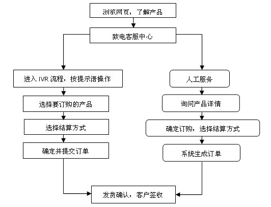顧客的電話(huà)訂購(gòu)主要有兩種方式:一種方式為在購(gòu)物平臺(tái)400或800電話(huà)的IVR流程中根據(jù)提示語(yǔ)音來(lái)完成訂購(gòu)過(guò)程;另一種方式為人工服務(wù),客服人員幫助顧客完成訂購(gòu)過(guò)程。