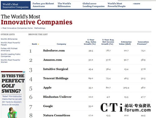 CTI論壇(ctiforum)8月15日消息(記者 張潔):2011年7月,由美國知名財(cái)經(jīng)雜志《福布斯》評選出的全球百大最具創(chuàng)新能力企業(yè)排行榜上,salesforce.com超越Facebook、蘋果、亞馬遜等知名企業(yè)位列第一。