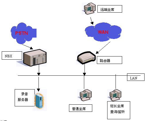 基于3Com NBX呼叫中心的錄音監(jiān)聽(tīng)系統(tǒng)的拓?fù)浣Y(jié)構(gòu)圖如下: