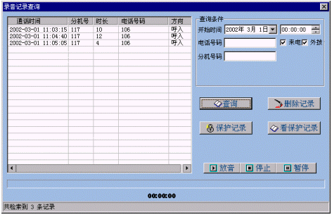根據(jù)該操作員的類(lèi)別判定該操作員具有那些權(quán)限(查詢、管理、監(jiān)聽(tīng)等),具備查詢權(quán)限的操作員可以按時(shí)間、分機(jī)號(hào)、來(lái)去點(diǎn)號(hào)碼等來(lái)查詢所有的錄音信息;具備管理權(quán)限的操作員可以進(jìn)行操作員管理以及對(duì)系統(tǒng)相關(guān)參數(shù)的設(shè)置;具備監(jiān)聽(tīng)權(quán)限的操作員可以監(jiān)聽(tīng)其他坐席的實(shí)時(shí)狀態(tài)。