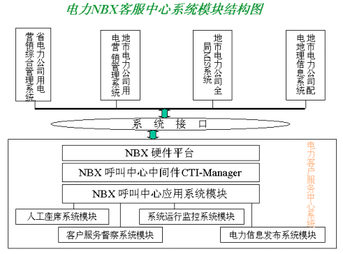 該方案以美國(guó)3COM公司的NBX產(chǎn)品為系統(tǒng)平臺(tái),結(jié)合其配套的中間件產(chǎn)品CTI-Manager和上層第三方專業(yè)的電力行業(yè)應(yīng)用系統(tǒng),為各省、市電業(yè)公司建立起新型的電力呼叫中心(Call Center)。使電力客服中心系統(tǒng)以呼叫中心為基礎(chǔ),以電力系統(tǒng)其他后方資源信息(CIS,DMS,負(fù)控等系統(tǒng))為依托,為客戶提供電話、傳真、郵件、Internet等多種接入方式,通過和電力其他業(yè)務(wù)系統(tǒng)有機(jī)的結(jié)合,滿足客戶不同層次、個(gè)性化與多樣化的業(yè)務(wù)需求,提供了包括錄音、會(huì)議電話、統(tǒng)一消息和智能路由在內(nèi)的多種功能。