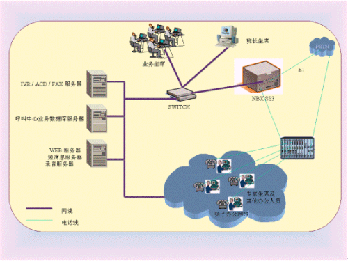 NBX SS3 網(wǎng)絡(luò)電話交換機(jī)作為基礎(chǔ)通信平臺,由北大方正電子技術(shù)有限公司在北京網(wǎng)音公司呼叫中心中間件進(jìn)行集成開發(fā),建立CTI,ACD、IVR、FAX、TTS及其應(yīng)用服務(wù),集成現(xiàn)有的WEB、mail、短消息系統(tǒng),建立統(tǒng)一消息平臺,新建和利用各業(yè)務(wù)數(shù)據(jù)庫,設(shè)計(jì)業(yè)務(wù)坐席及客戶端軟件。