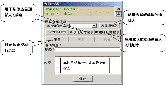 如果有電話打入時(shí),在屏幕的右側(cè)會彈出一個(gè)對話框,它顯示了當(dāng)前來電的號碼和通話人(如果在地址簿中沒有記錄則顯示為未知),點(diǎn)擊彈出全部菜單功能,它相當(dāng)于一個(gè)功能強(qiáng)大的通話記事本,用它既可以邊接聽電話邊整理相關(guān)通話的文字記錄,又可以錄下通話的全部內(nèi)容。如果這個(gè)電話是您不愿接聽的,也可以將它設(shè)置為“免打擾”,這樣,這個(gè)號碼以后將存入免打擾名單中,若此號碼再呼入,系統(tǒng)將自動(dòng)掛斷此呼叫。如果這個(gè)電話是您認(rèn)為的重要客戶打過來的,您也可以將此號碼添加到重要客戶組中,以便您今后接聽或設(shè)置電話轉(zhuǎn)移時(shí)能與其它呼入電話相區(qū)分。