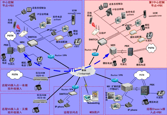 ③.遠(yuǎn)程接入的辦公室不再需要專用的 PBX, 只需要將3Com NBX電話終端接入到WAN網(wǎng)中,就能地實(shí)現(xiàn)在WAN或Internet上與3Com