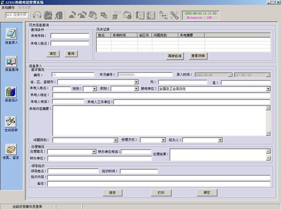 - 完善業(yè)務(wù)統(tǒng)計(jì)工作:針對(duì)健康熱線采集的信息,我們根據(jù)實(shí)際需要設(shè)計(jì)了統(tǒng)一格式的各項(xiàng)報(bào)表,同時(shí)將報(bào)表全部做電子化處理,方便業(yè)務(wù)數(shù)據(jù)的統(tǒng)計(jì)及管理,為各級(jí)領(lǐng)導(dǎo)決策提供可靠依據(jù)。