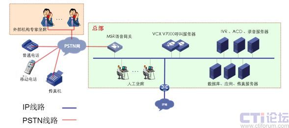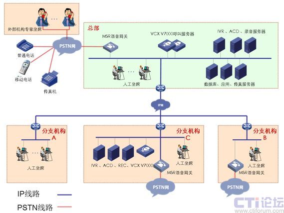 總部部署呼叫中心,VCX V7000呼叫中心平臺采用純IP部署方式,可根據(jù)用戶的實際環(huán)境,靈活部署,各設(shè)備模塊不受地理位置的限制,降低整體平臺的部署成本。