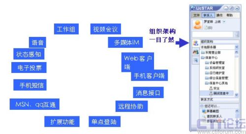 UcSTAR :Unified Communication Star,是深圳市擎旗信息技術(shù)有限公司推出的企業(yè)級融合通信平臺。是融合多種通訊手段(IM、文件、視頻、語音、EMAIL、SMS、電話、VOIP、MSN/QQ互通),融合企業(yè)的多種應(yīng)用系統(tǒng)緊密集成(OA、CMS、ERP、EIP、Portal、網(wǎng)站、應(yīng)用軟件),交流對象和交流內(nèi)容可管理,可控制,可擴(kuò)展,輕松實現(xiàn)部署企業(yè)的統(tǒng)一工作平臺。 UcSTAR能統(tǒng)一消息、統(tǒng)一溝通、統(tǒng)一管理、隨意選擇多種溝通手段,深航一直在找這樣的一種產(chǎn)品,公司信息部門從上到下給予極高的重視,商務(wù)的過程也都開了綠燈,一路順暢。
