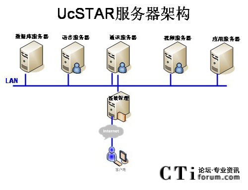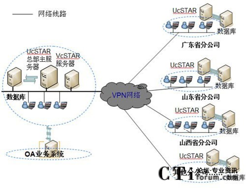 在公司總部部署主UcSTAR服務器,全國省級分公司分別部署一套子UcSTAR服務器,組成星型結構公司內部的溝通與協(xié)作系統(tǒng)。
