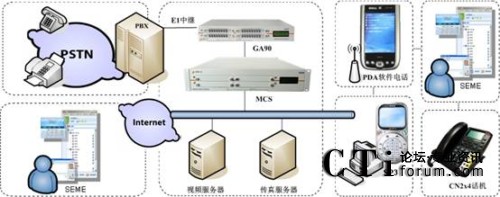 1)由MCS與該企業(yè)原有的大型傳統(tǒng)PBX進(jìn)行對接,MCS主要處理語音交換,具備IP-PBX和VOIP網(wǎng)關(guān)的功能,還具有IVR(交互式語音應(yīng)答)和ACD(自動呼叫分配)等呼叫中心功能,并為SEME提供服務(wù)。