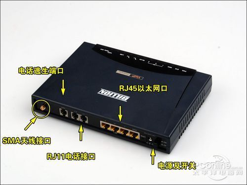 BiPAC 6404VGP后面接口板除了和普通無線路由器一樣有1個(gè)WAN接口,4個(gè)LAN接口外,還多出了三個(gè)RJ11的電話接口,這個(gè)就是用來連接傳真機(jī)或電話機(jī)的。此外,考慮到BiPAC 6404VGP的無線功能在企業(yè)中應(yīng)用需要有較大的信號(hào)覆蓋范圍,所以它還提供了一個(gè)SMA天線接口可用來連接高增益天線。