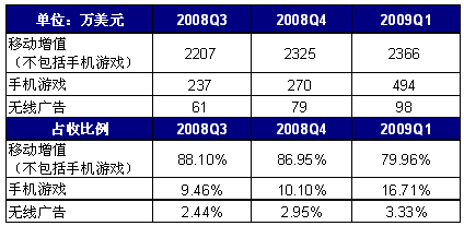 空中網(wǎng)2009年第1季度總營收為2960萬美元,其中總無線增值服務(wù)(不包括手機(jī)游戲)營收為2366萬美元,同比增長19%,比上一季度增長2%,占總營收的79.96%,而手機(jī)游戲和無線廣告分別占比16.71%、3.33%。易觀國際(Analysys