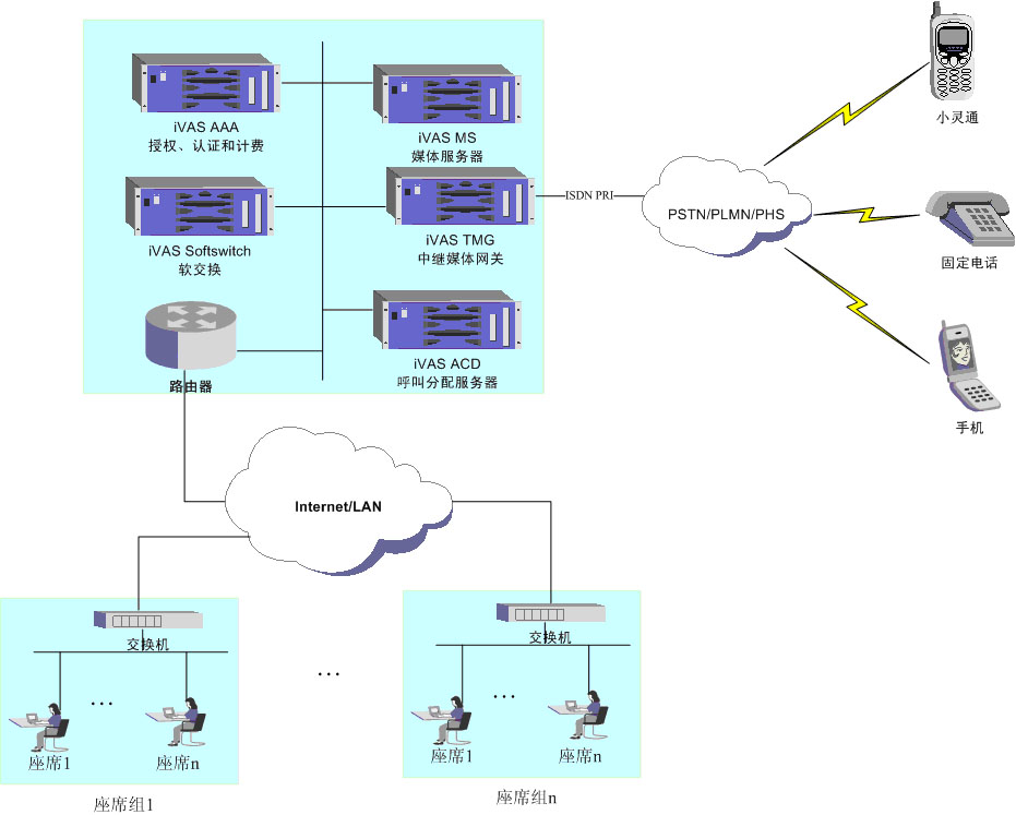iVAS Agent:人工座席,可以采用IAD+普通的電話,或者SoftPhone方式接聽來電