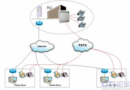 通過這種架構,各連鎖分店的話機與總部內(nèi)部話機之間的聯(lián)系便可以透過IP網(wǎng)絡進行,無須再支付任何長途通話費用。