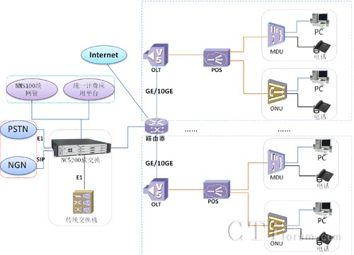 震有科技根據(jù)行業(yè)客戶的需求,推出了“NC5200系列產(chǎn)品+xPON產(chǎn)品”的行業(yè)接入網(wǎng)綜合應(yīng)用解決方案,即“NGN+xPON”行業(yè)應(yīng)用解決方案。該方案主要采用了NGN架構(gòu)的軟交換技術(shù)與xPON技術(shù)相結(jié)合,實現(xiàn)了從傳統(tǒng)的接入網(wǎng)向光纖接入網(wǎng)平滑過渡升級。該解決方案中NC5200系列產(chǎn)品主要完成語音交換及與語音相關(guān)的增值業(yè)務(wù)功能;xPON產(chǎn)品在該方案中作為語音、數(shù)據(jù)、視頻業(yè)務(wù)的承載平臺,主要滿足了語音、數(shù)據(jù)及CATV或IPTV綜合業(yè)務(wù)接入要求。